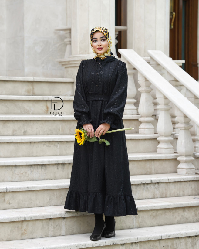 این عبای مشکی با پارچهی خامهدوزی شده و پولکهای ریز و خوشچین،