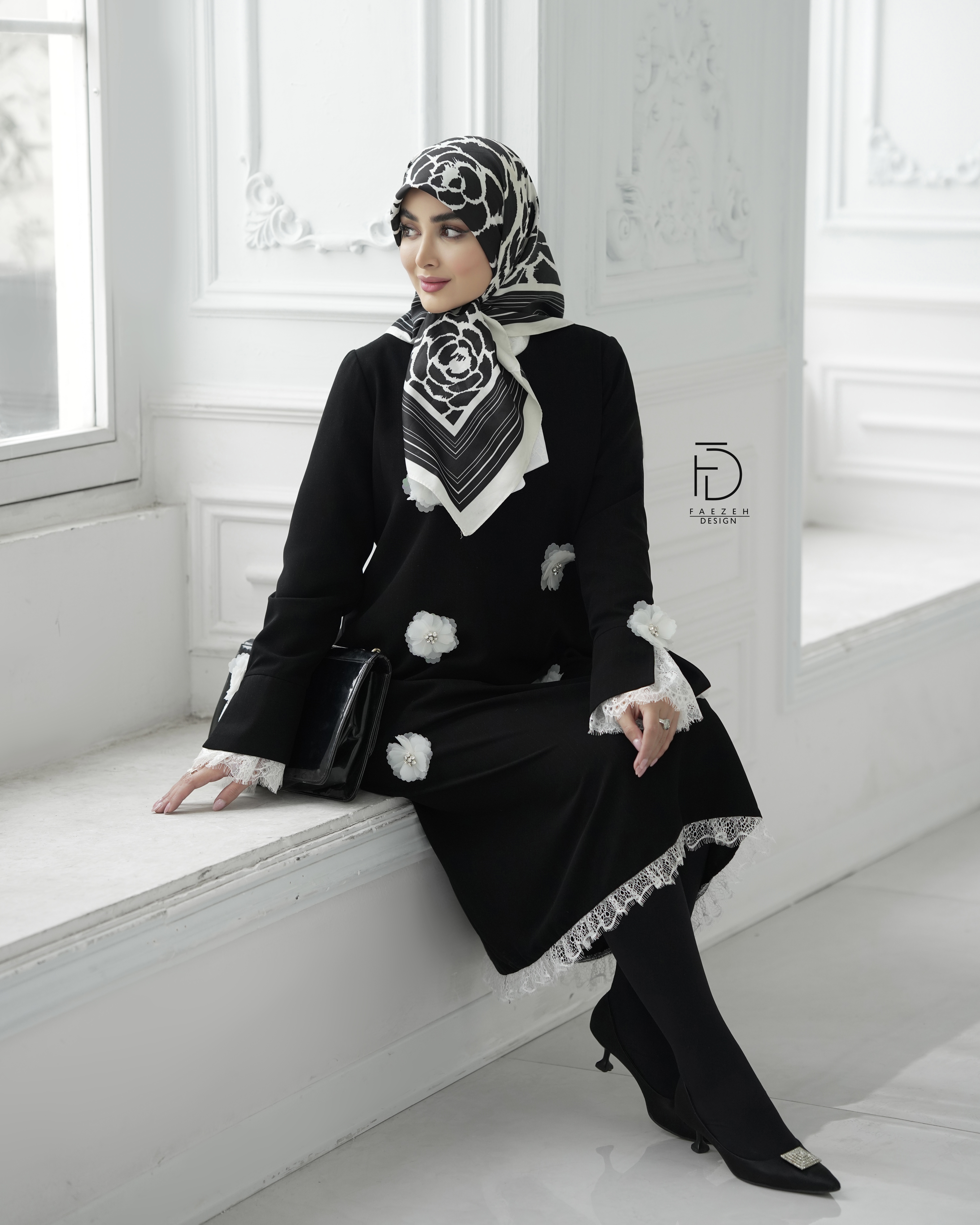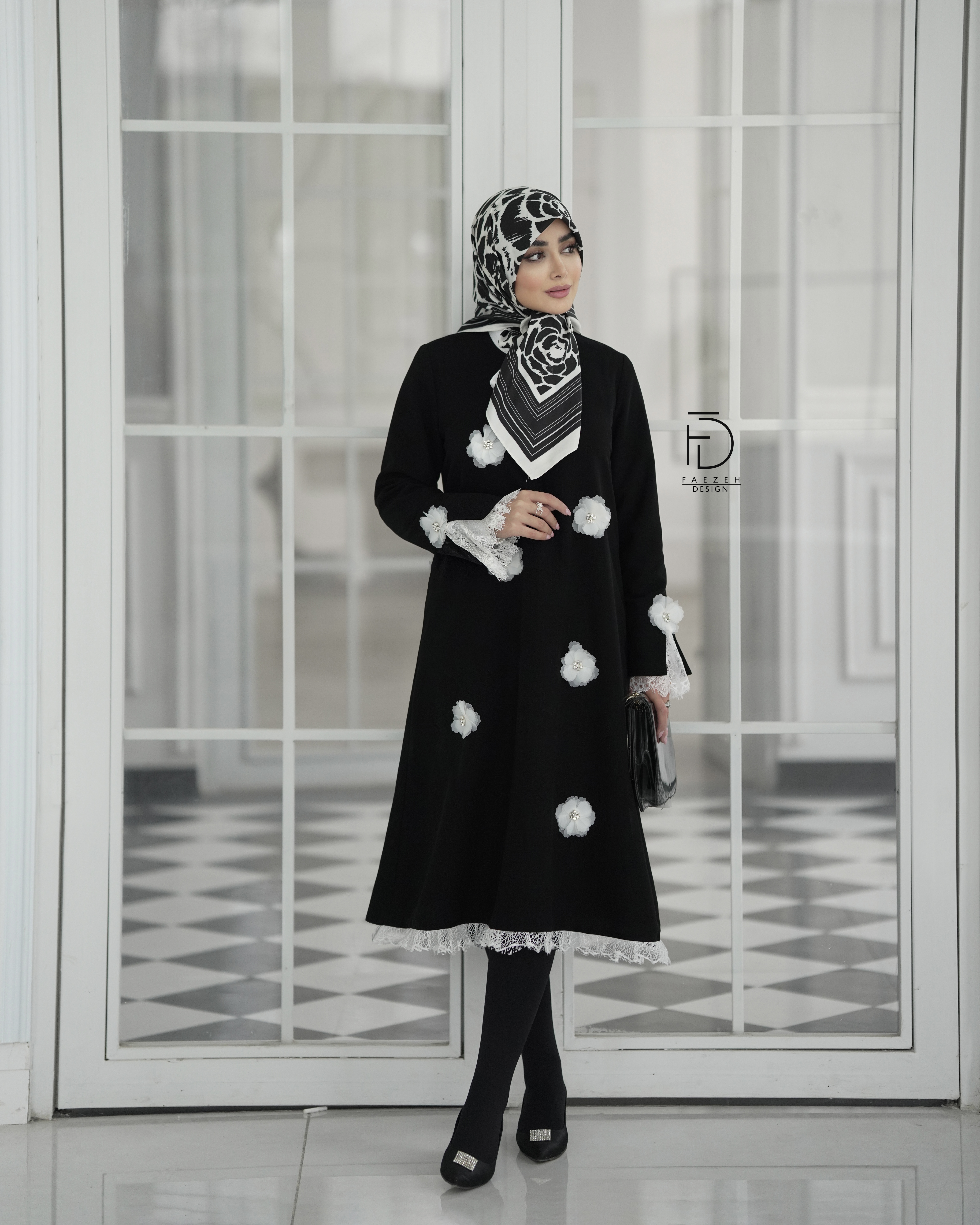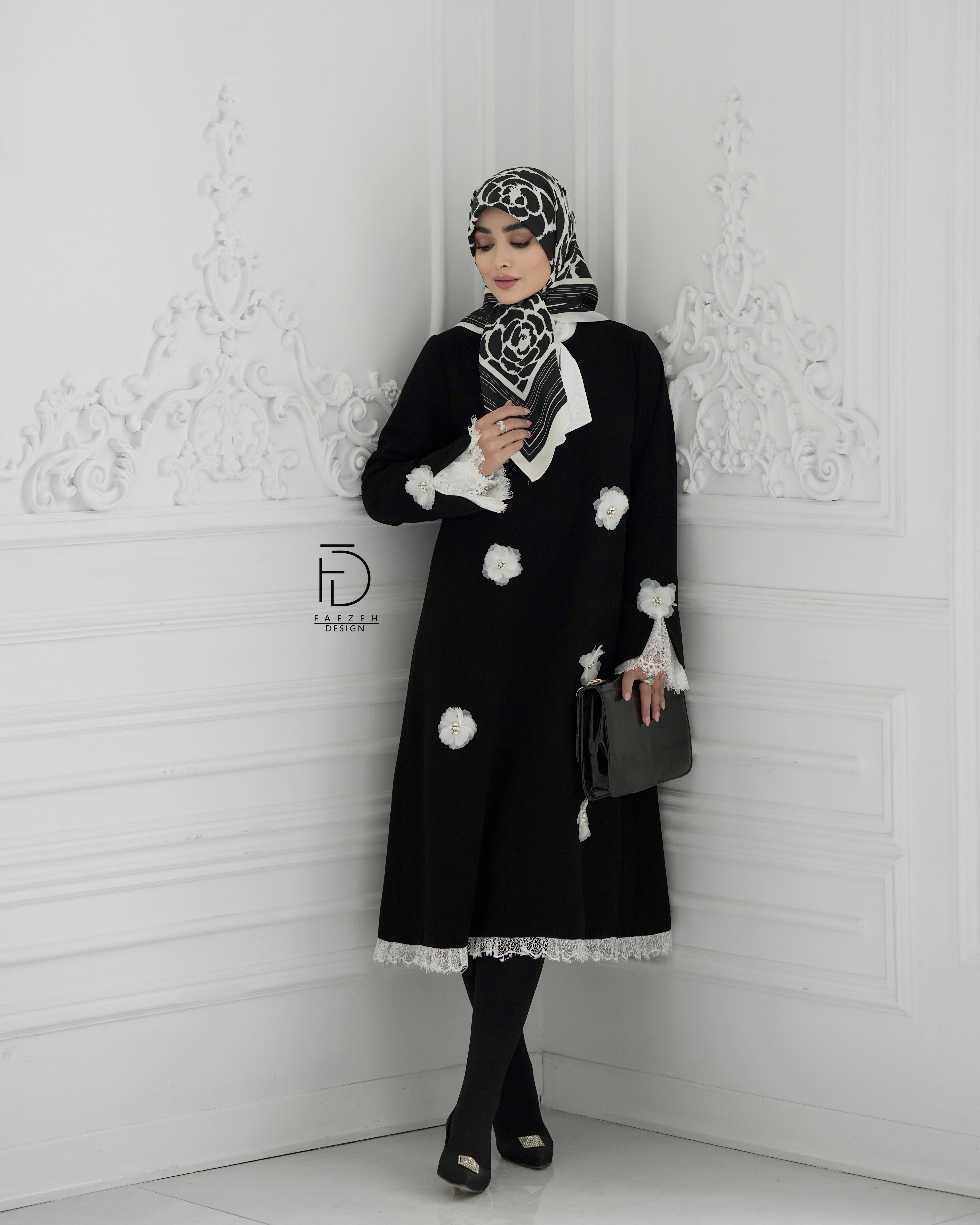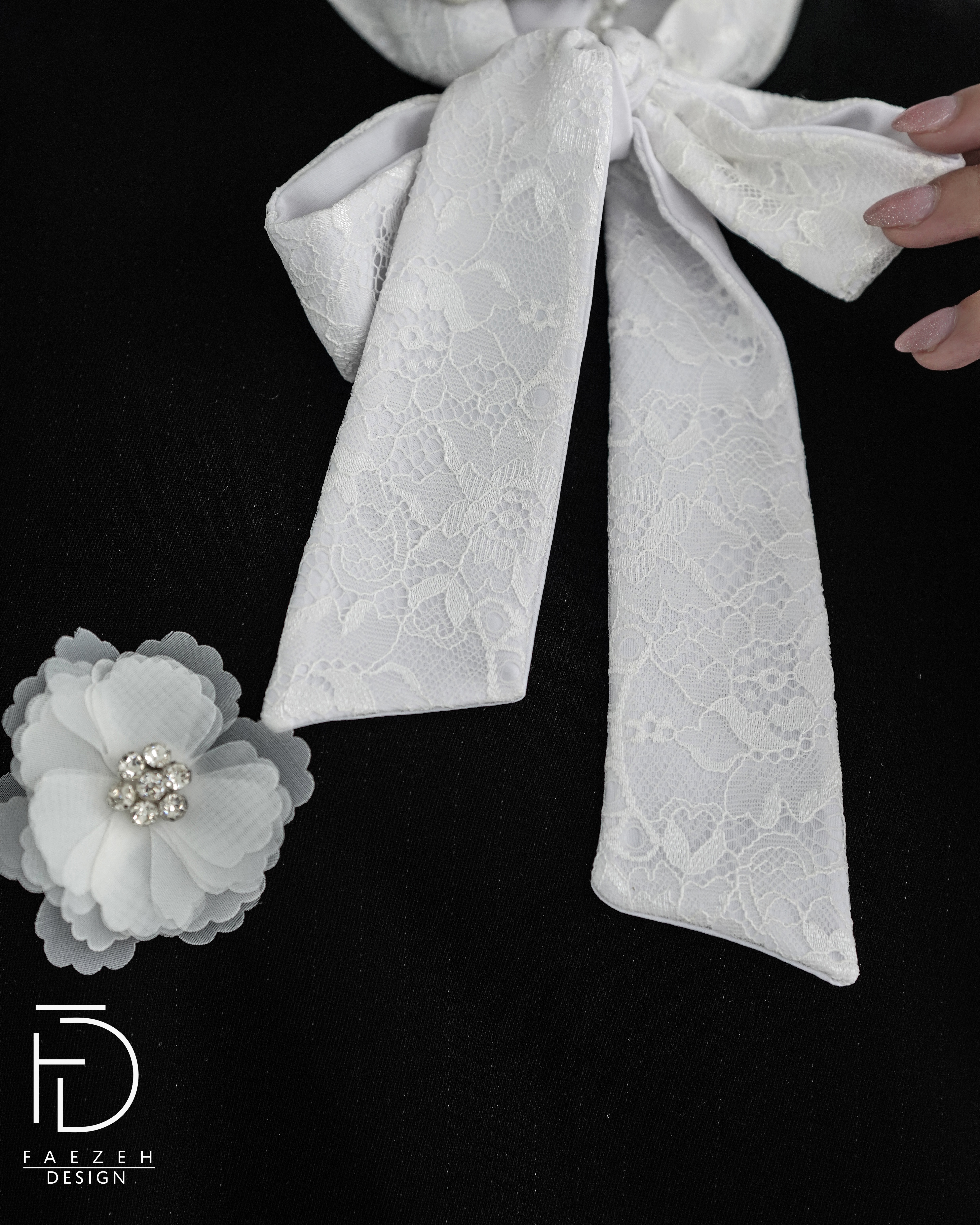 و روی لباس گلهای سفید با سنگدوزی خیلی ظریف کار شده