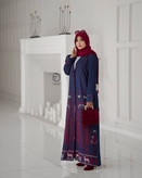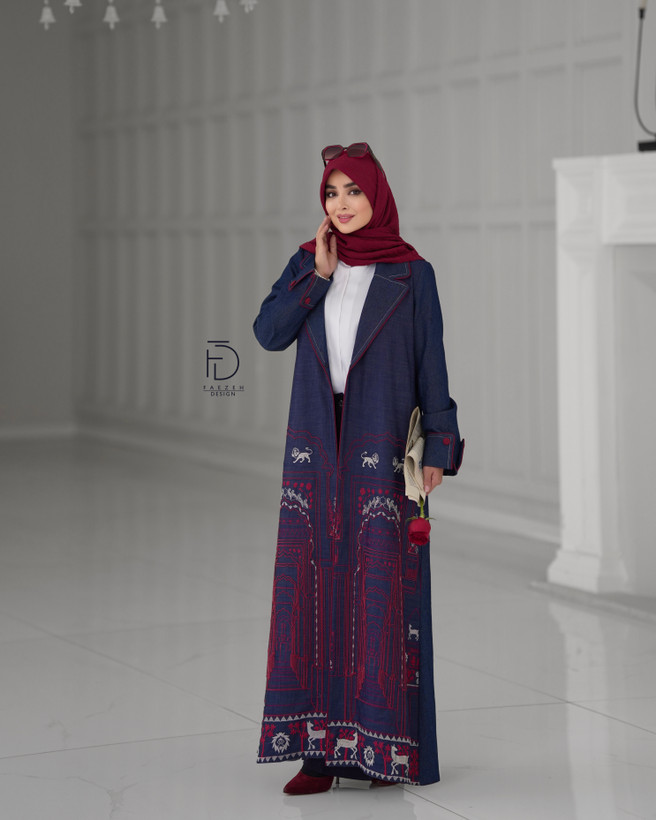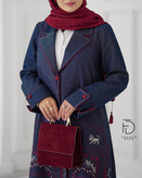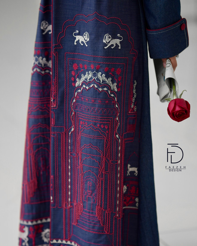در قسمت جلوی عبا، مغزیدوزی زرشکی با دقت بالا اجرا شده و پشت کار هم با مغزیدوزی و گلدوزی هماهنگ تکمیل شده تا لباس از هر زاویهای بینقص و جذاب باشه.