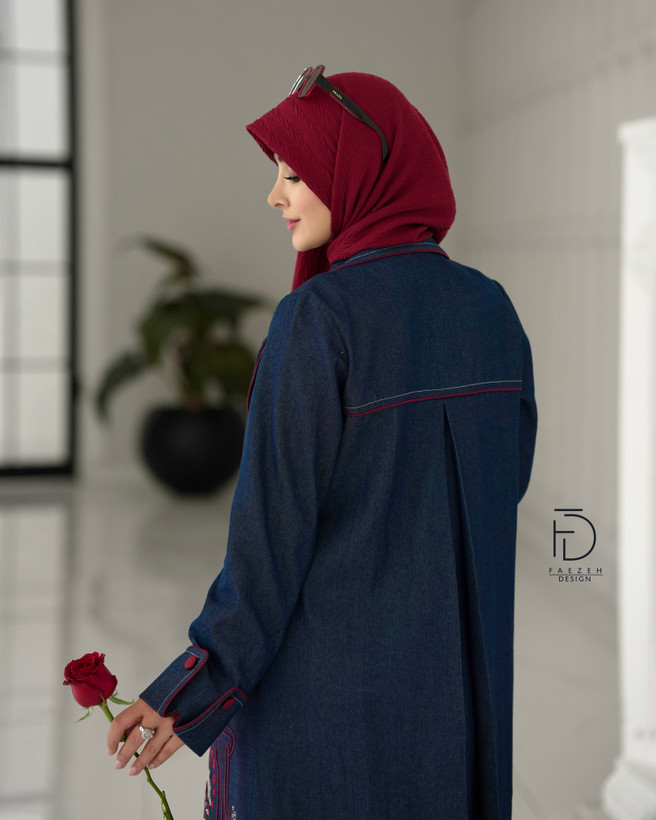 یقهی انگلیسی کار شده با مغزیدوزی زرشکی در کنار کوکدوزی ظریف با نخ سفید، تضاد رنگی فوقالعادهای ایجاد کرده که هم استایل رو مدرن نشون میده هم حس اصالت و ظرافت رو منتقل میکنه. این جزئیات باعث شده روژا VIP از حالت ساده خارج بشه و کاملاً متفاوت به نظر بیاد.